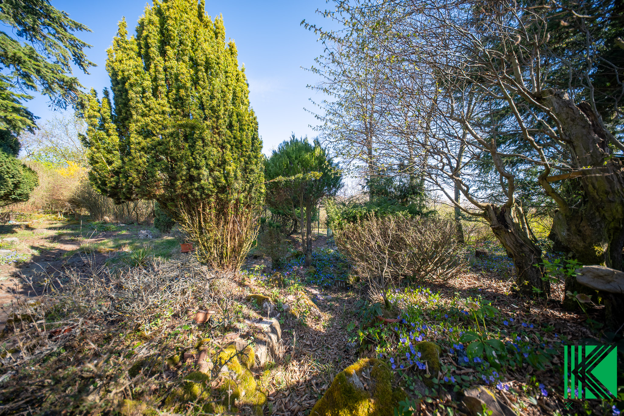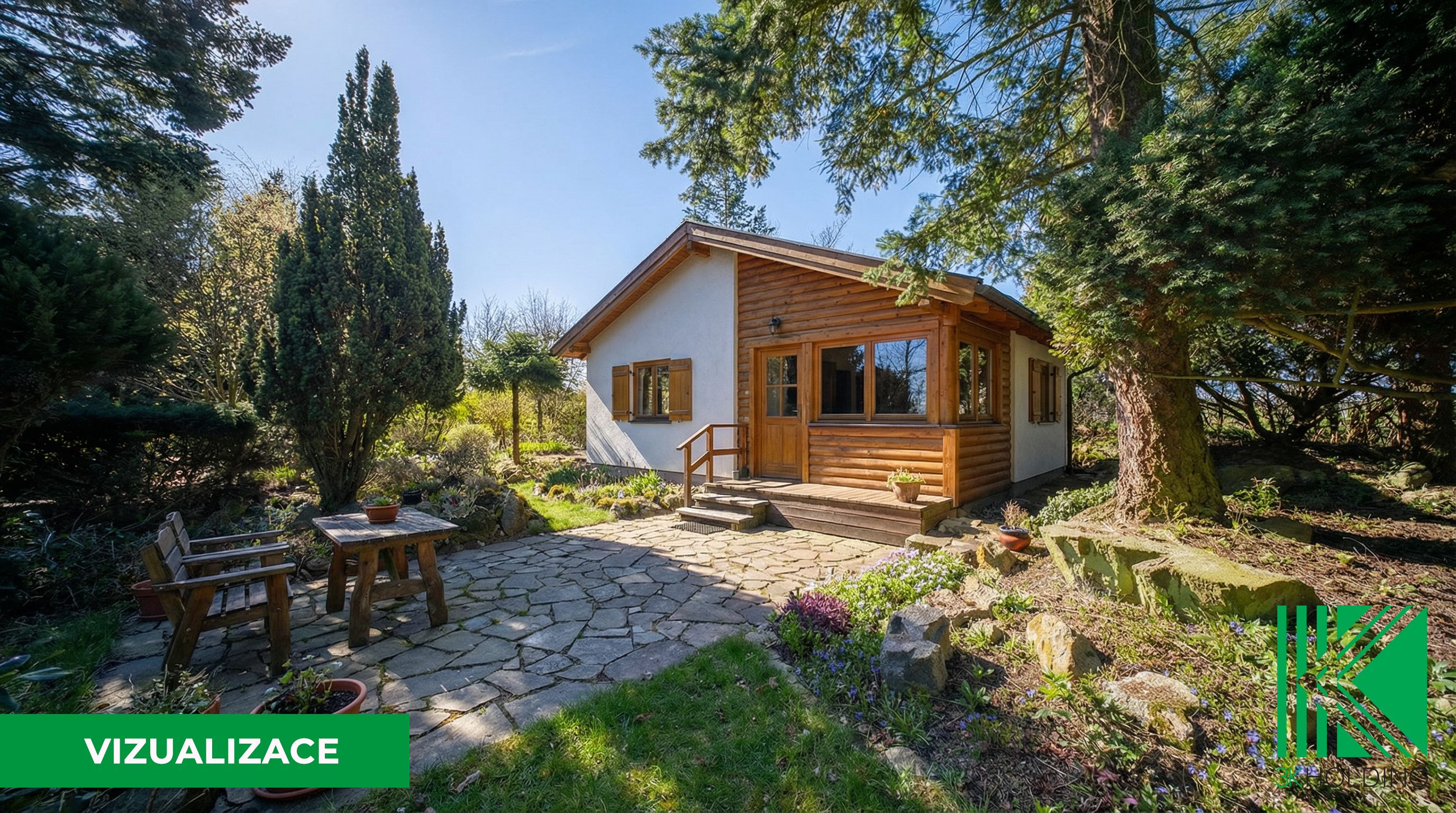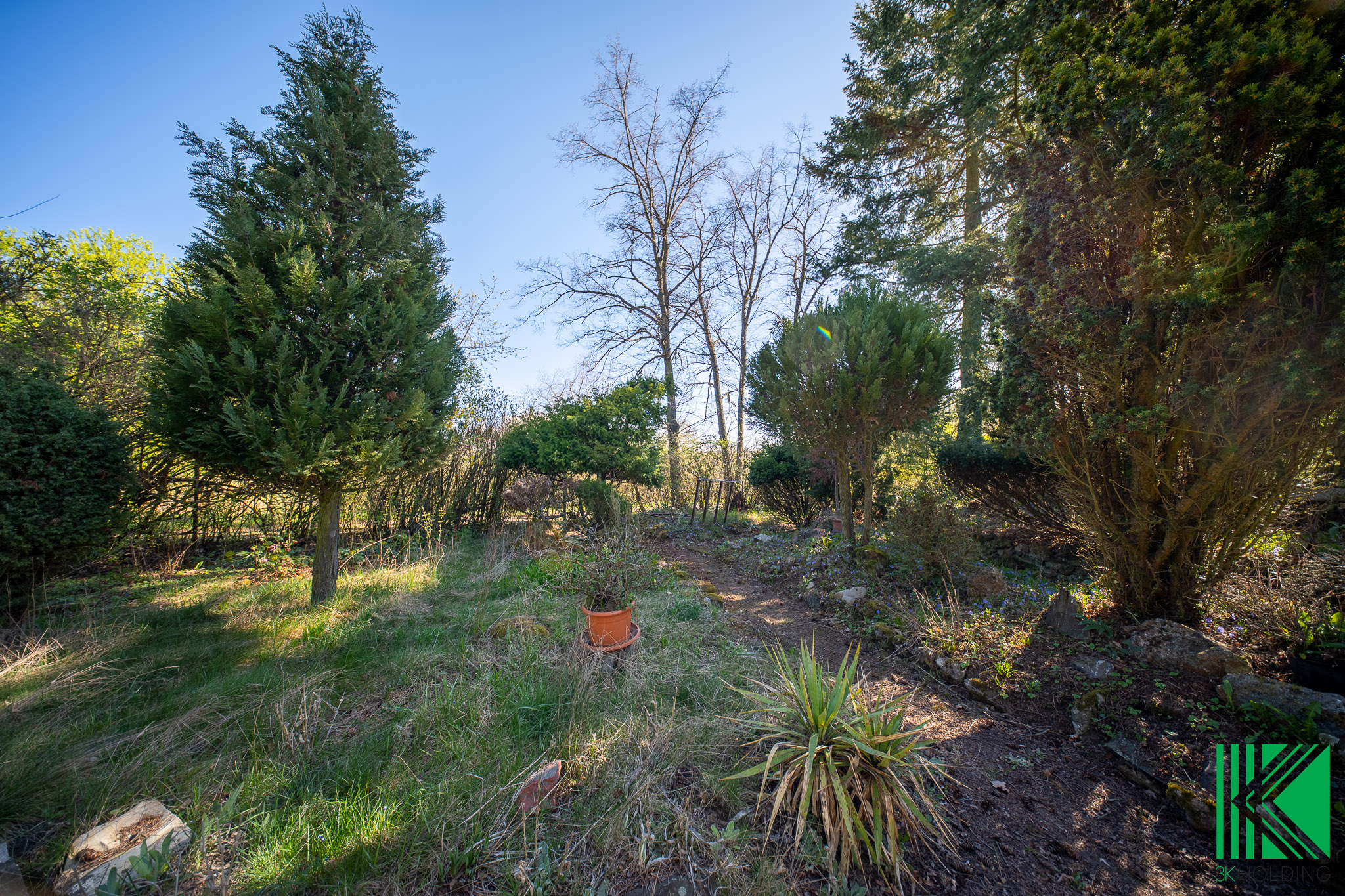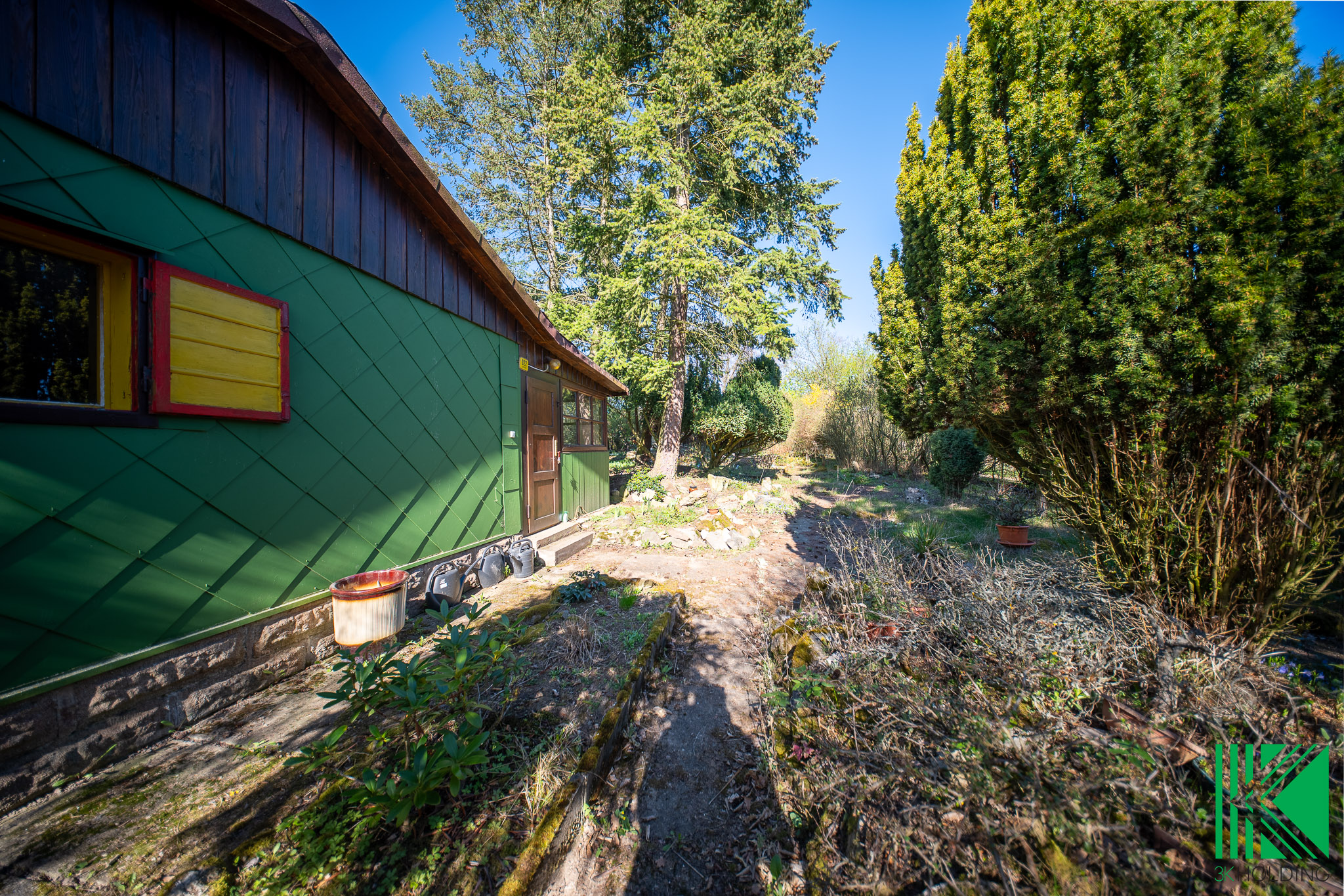 Dominantou pozemku jsou vzrostlé jehličnaté stromy a keře, které zajišťují příjemné soukromí, stín v letních měsících a celkově dotvářejí klidnou atmosféru místa.
